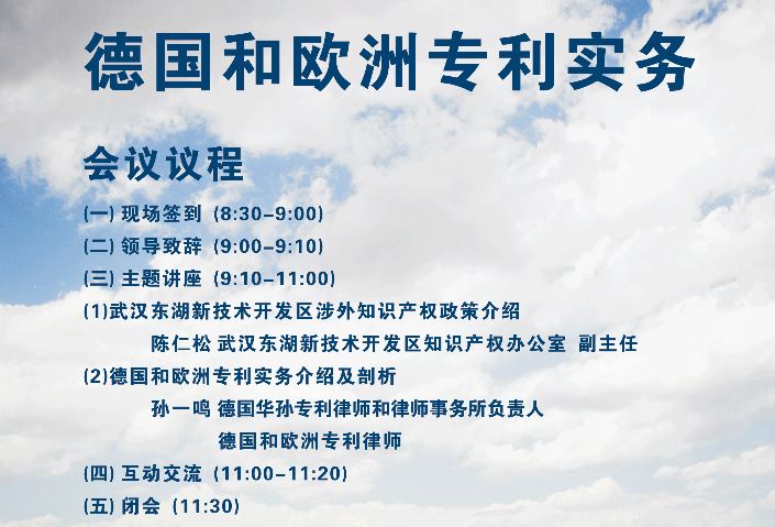 为帮助企业进一步熟悉德国和欧洲专利实务问题,提升企业知识产权海外布局水平并为开拓德国和欧洲市场提供助力,由武汉市科学技术局(市知识产权局)、中国(武汉)知识产权保护中心及武汉东湖新技术开发区知识产权办公室主办,武汉知识产权研究会、德国华孙专利律师和律师事务所承办的德国和欧洲专利实务公开课将于2018年7月10日(星期二)上午在武汉光谷资本大厦5楼报告厅举行。