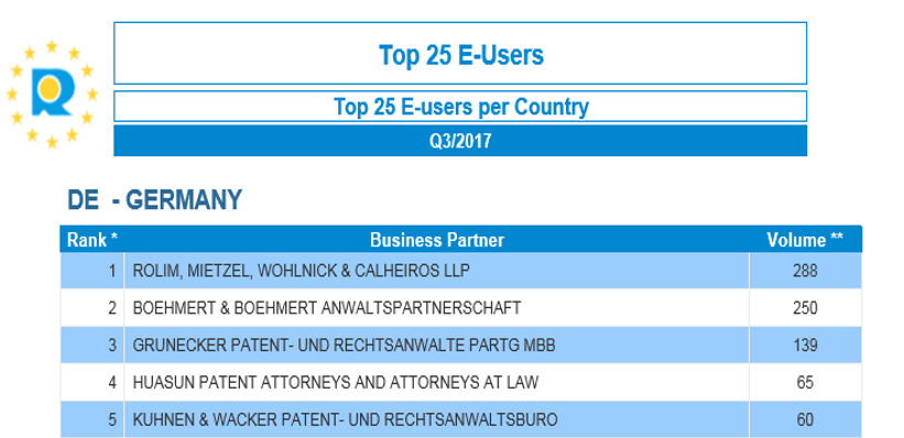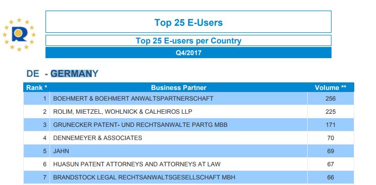目前,申请的电子提交已经成为欧洲知识产权官方机构前的普遍做法。作为欧盟外观设计和欧盟商标的官方注册机构,欧盟知识产权局(EUIPO)于2018年1月25日公布了2017年第四季度电子提交申请/异议程序数量的代理机构排名。